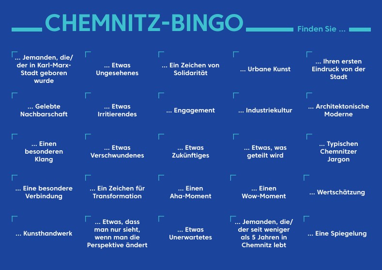 Chemnitz bekommt ein neues, kreatives Entdeckungsformat: Mit dem Stadt-Bingo können Einheimische und Gäste ihre Umgebung auf spielerische Weise erkunden. Das interaktive Angebot verbindet Bewegung, Neugier und Spaß und macht den Stadtbummel zu einem abwechslungsreichen Erlebnis. Es schult den Blick für besondere Details und kleine Begegnungen. Inspiriert durch den Chemnitzer Verein Bordsteinlobby wurde das Spiel im Kulturhauptstadtjahr im Projekt des Makers, Business & Arts Projekts entwickelt und produziert.